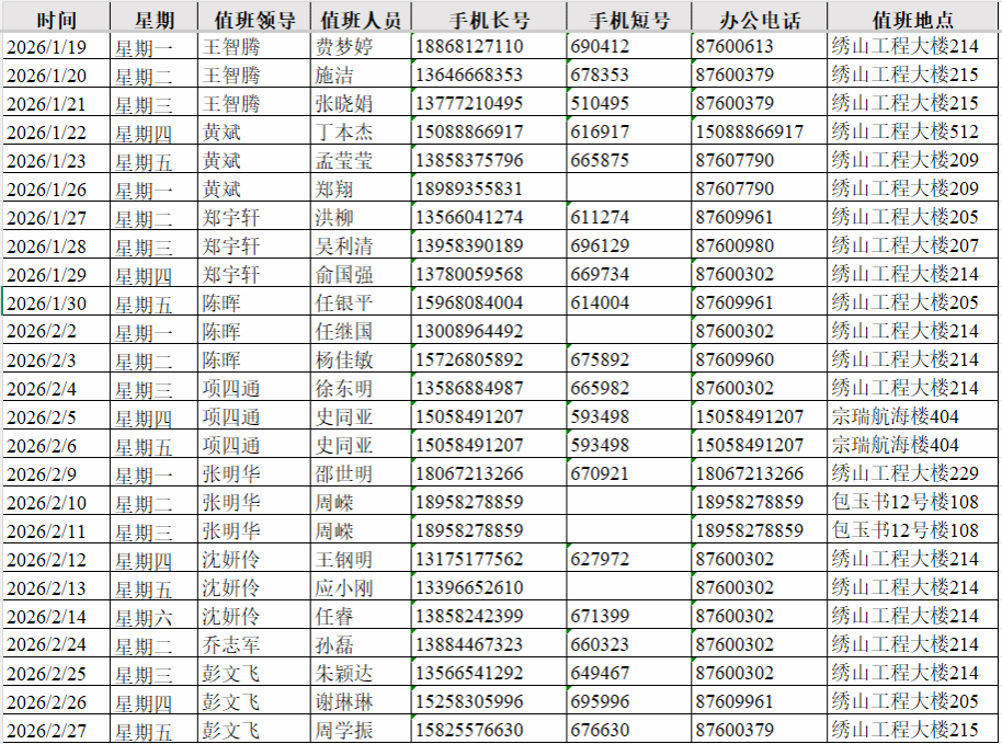3.按时值守,保持手机畅通,及时回应师生需求,机关部门值班安排详见:学校内网—“部门通知”—2026年寒假各单位部门值班安排汇总表。