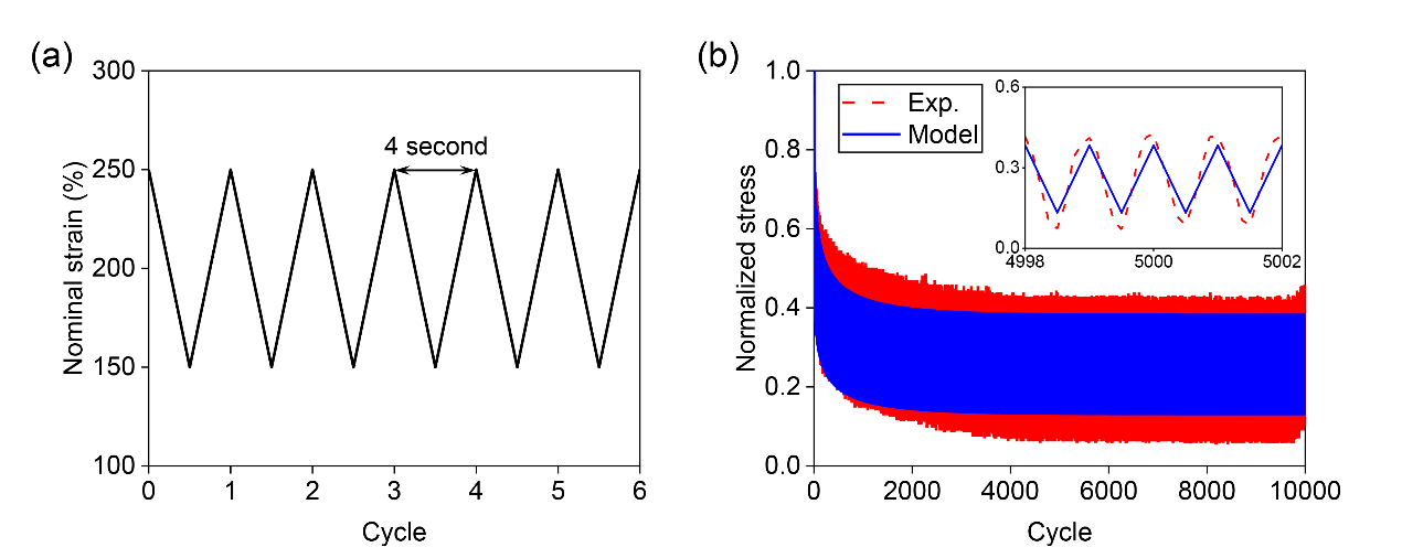 为第一署名单位,在国际固体力学旗舰期刊《Journal of the Mechanics and Physics of Solids》(2023, 179, 105400)上发表以“Network alteration of cyclically loaded elastomers mediated by dynamic bonds” 为题的最新研究成果,建立了基于微观变形机制的本构模型准确描述动态交联网络弹性体在高周期、大变形条件下的疲劳响应。