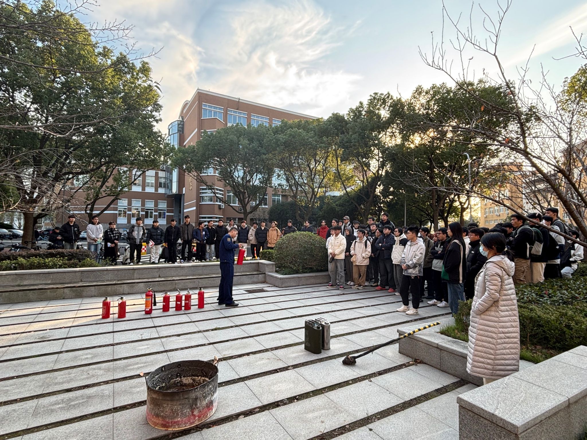 理论培训后,队伍转移至学院后门空旷场地进行灭火器实操演练。泮站长逐一介绍干粉灭火器、二氧化碳灭火器的适用场景与操作步骤,并设置模拟火源组织师生分组实践。参与学生轮流提起灭火器,按照“提拔握压”四步法对准火源根部喷射,成功扑灭明火后纷纷感叹:“亲身体验后才发现,灭火需要冷静判断风向与站位,远比想象中更具挑战性。”