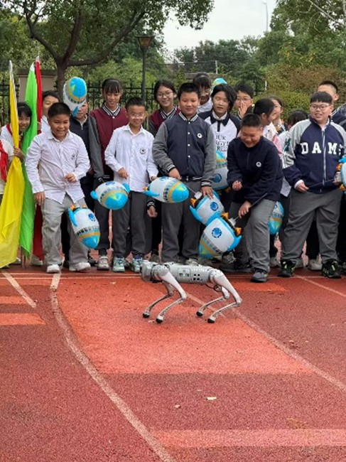 自主研发的机器狗,不仅能够流畅地完成各种复杂动作,还能与学生进行互动。它灵活的步态、精准的动作和强大的智能功能引起了在场师生的极大兴趣。学生们争相与机器狗合影,亲身体验科技的魅力,活动现场气氛热烈。