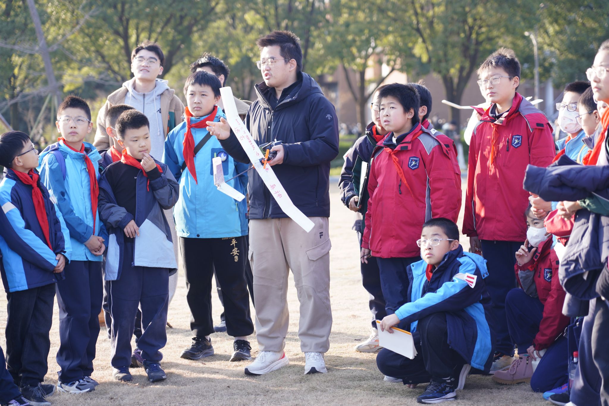 学生的带领下,孩子们亲手组装、调试模型飞机。当亲手制作的飞机成功翱翔蓝天时,草坪上响起了阵阵欢呼与掌声,科学的梦想也随之飞扬。